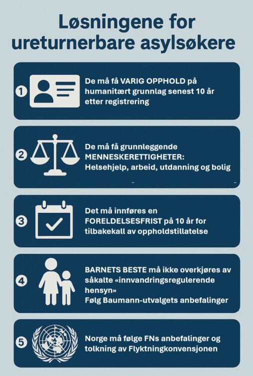 Vi er bekymret for den forverrede livssituasjonen som har oppstått for de asylsøkerne som det over tid ikke har vært mulig å returnere til sine hjemland. De befinner seg i en fastlåst situasjon der livet er satt på vent. De er uten grunnleggende helse- og sosialtjenester og uten mulighet til å forsørge seg selv.